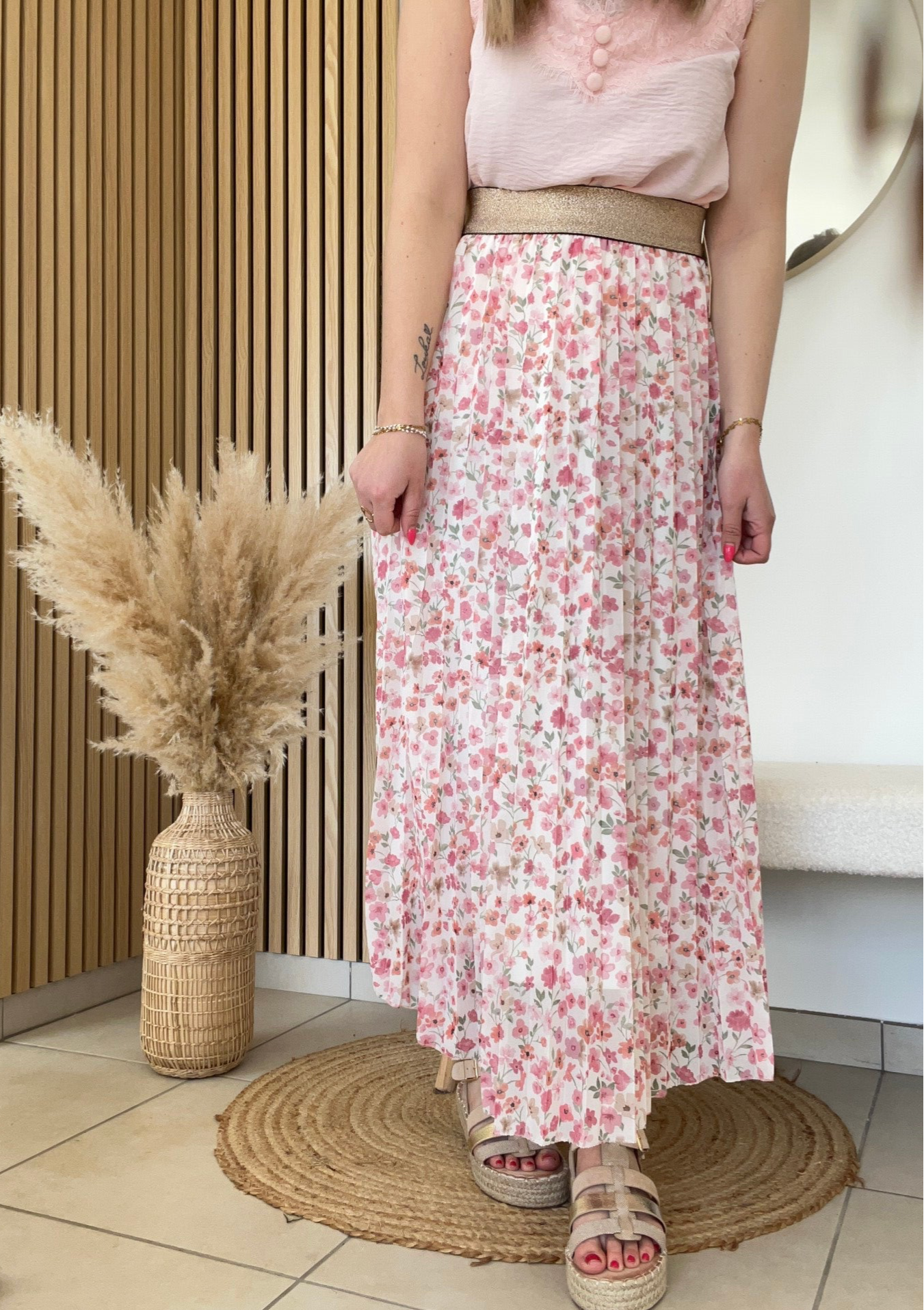 Une magnifique jupe imprimée, fleurs en dégradé de rose, avec un peu de vert