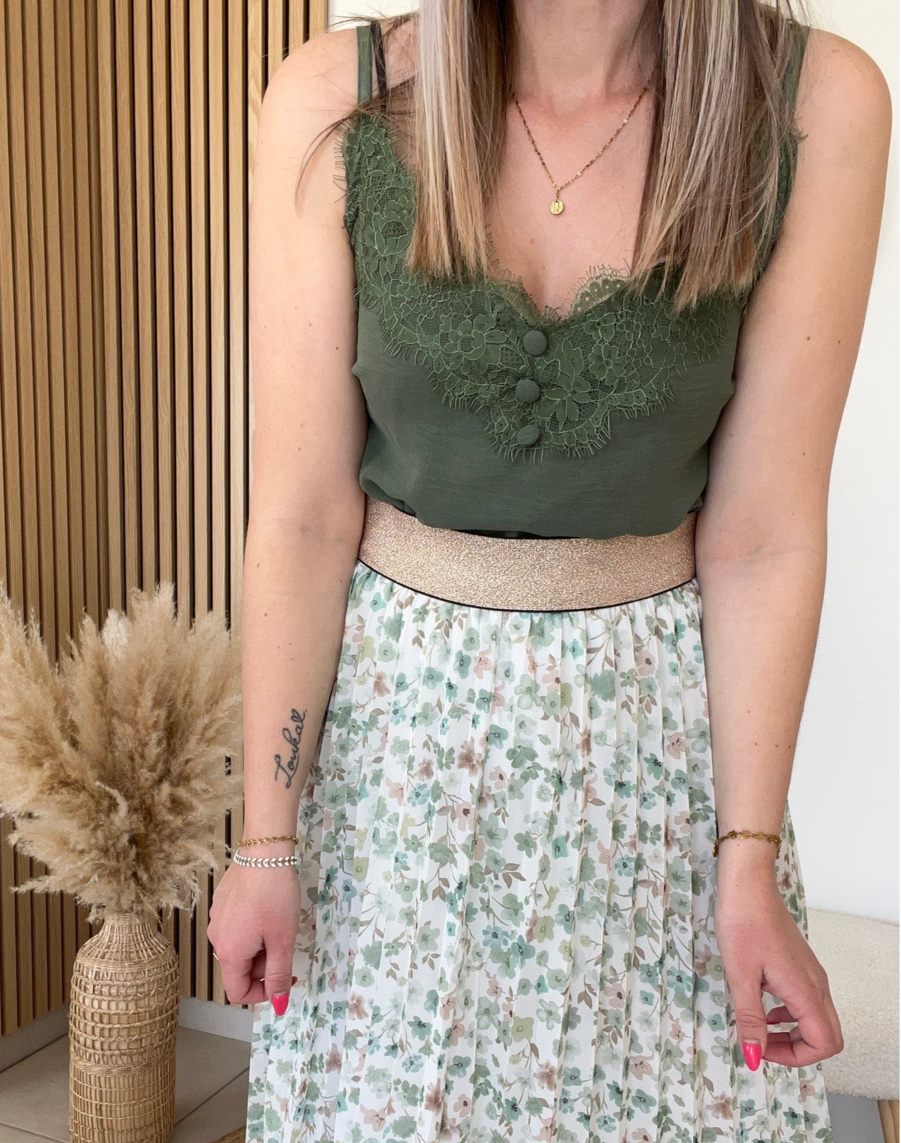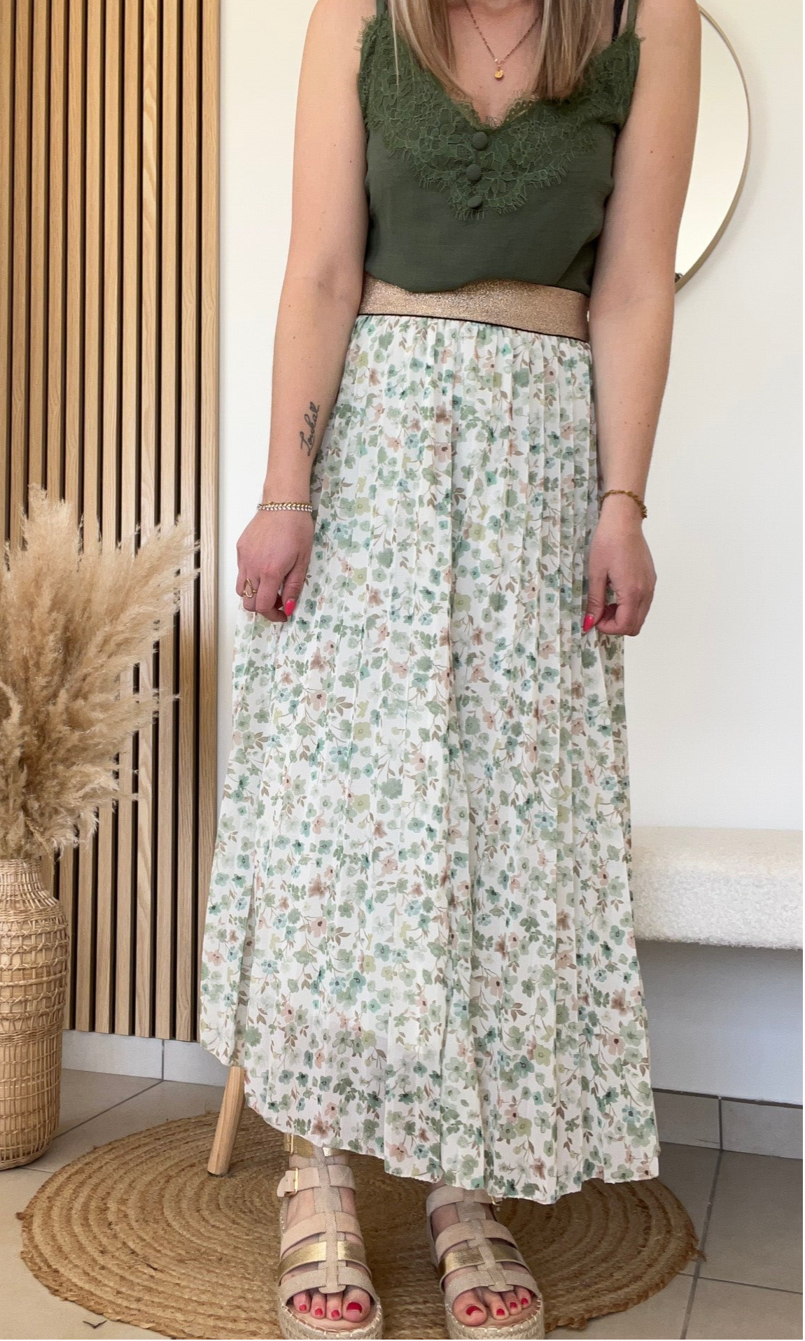 Magnifique jupe à l'imprimer, fleur, vert blanc avec son joli bandeau dorée, élastiqué qui maintient parfaitement bien la taille.