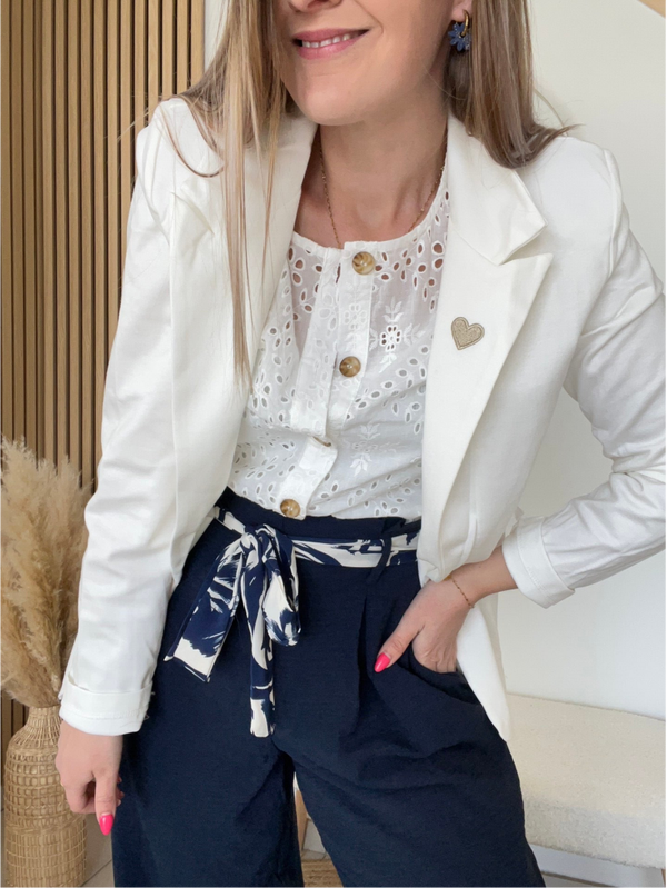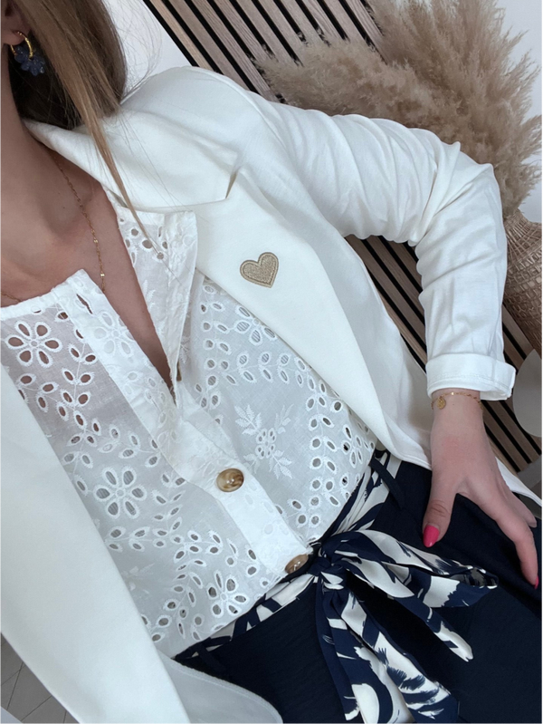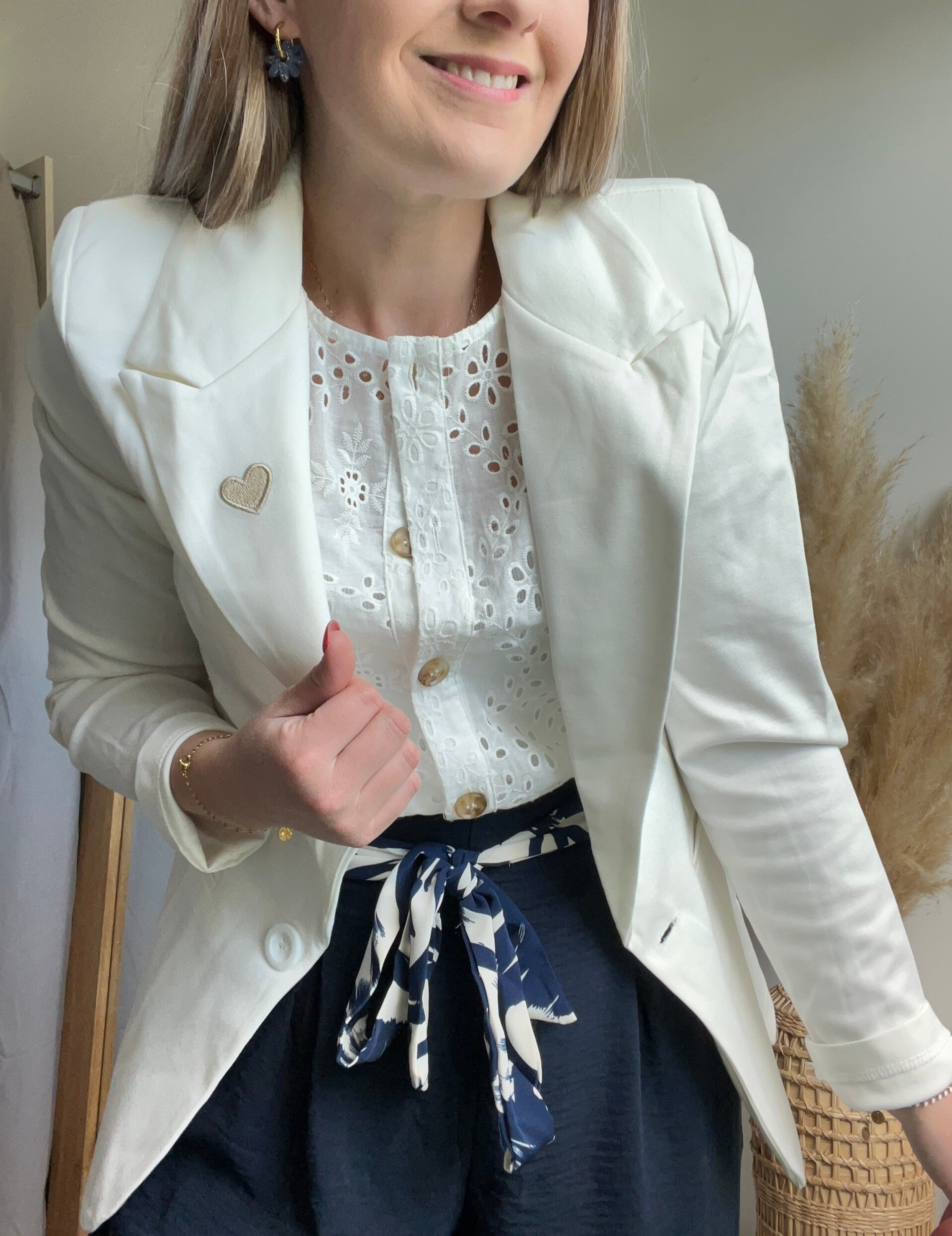 Une magnifique veste blanche, cintrée avec son joli petit cœur doré sur le devant.